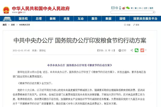 近日,中共中央辦公廳、國務(wù)院辦公廳印發(fā)了《糧食節(jié)約行動方案》。(圖片來源:中華人民共和國中央人民政府網(wǎng)站)